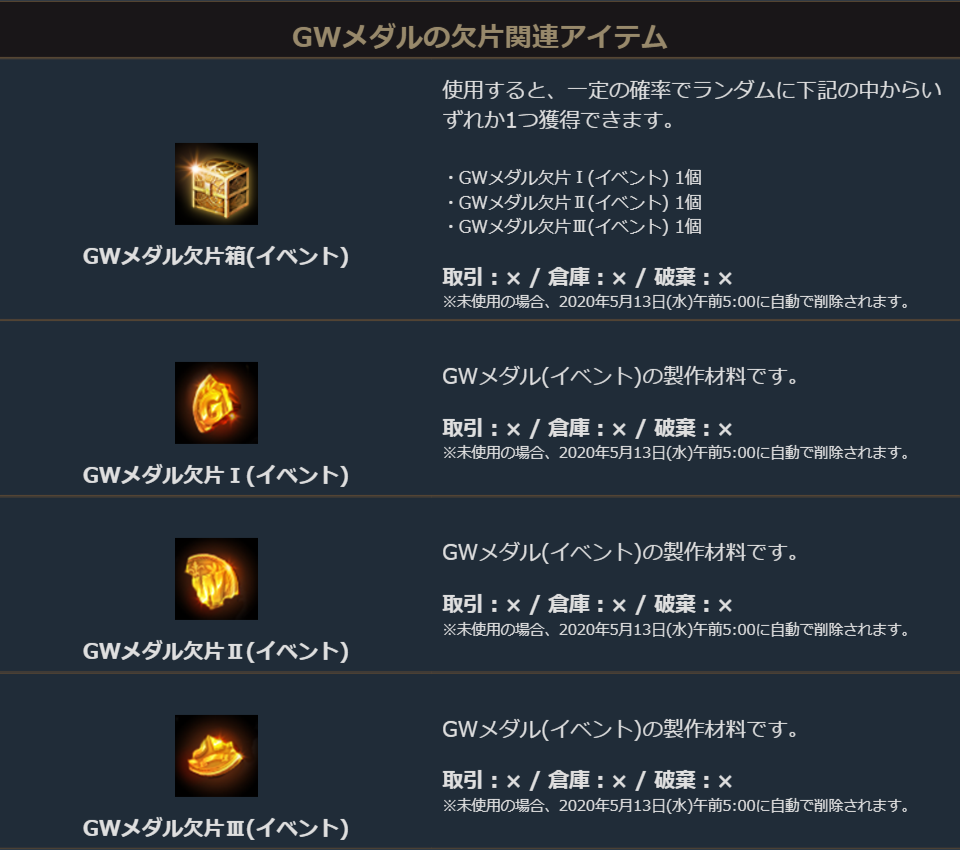 イベントクエスト「ゴールデンウィークⅡ」や「ゴールデンウィークⅢ」で獲得した「GWメダルの欠片箱(イベント)」を使用すると「GWメダルの欠片Ⅰ~Ⅲ(イベント)」の中から、いずれか1つランダムに獲得します。