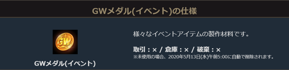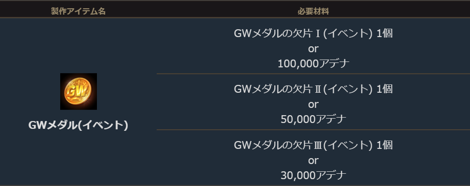 「GWメダルの欠片Ⅰ~Ⅲ(イベント)」をそれぞれ1個ずつ材料とすることで、「GWメダル(イベント)」を「メニュー > 限定 > イベント」で製作することができます。