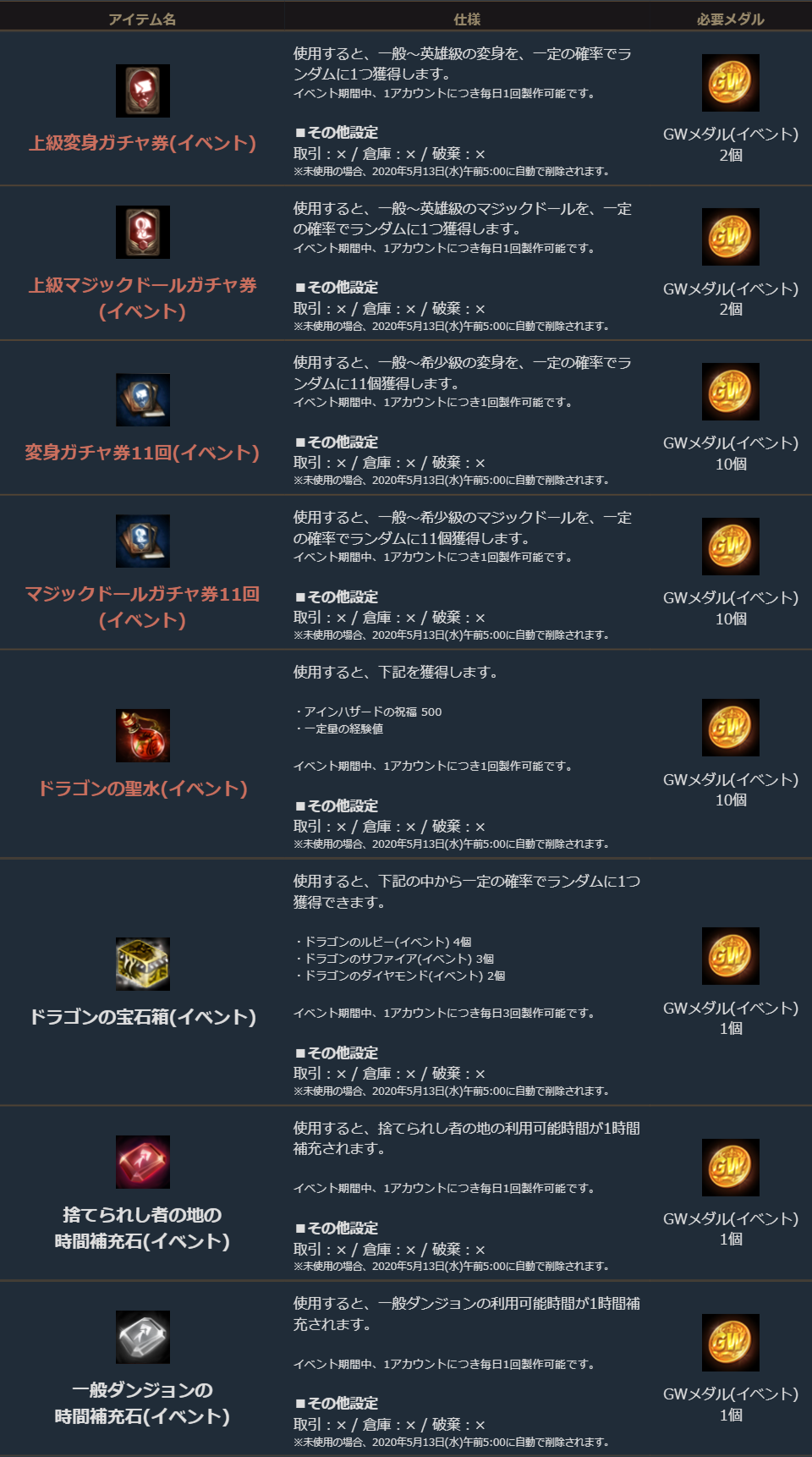 「GWメダル(イベント)」を一定数集めると下記のアイテムを獲得することができます。