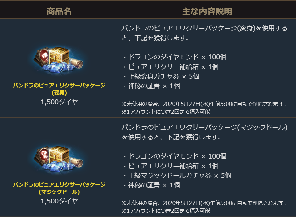 ※パンドラのピュアエリクサーパッケージは、1アカウントにつきそれぞれ2回まで購入可能です。