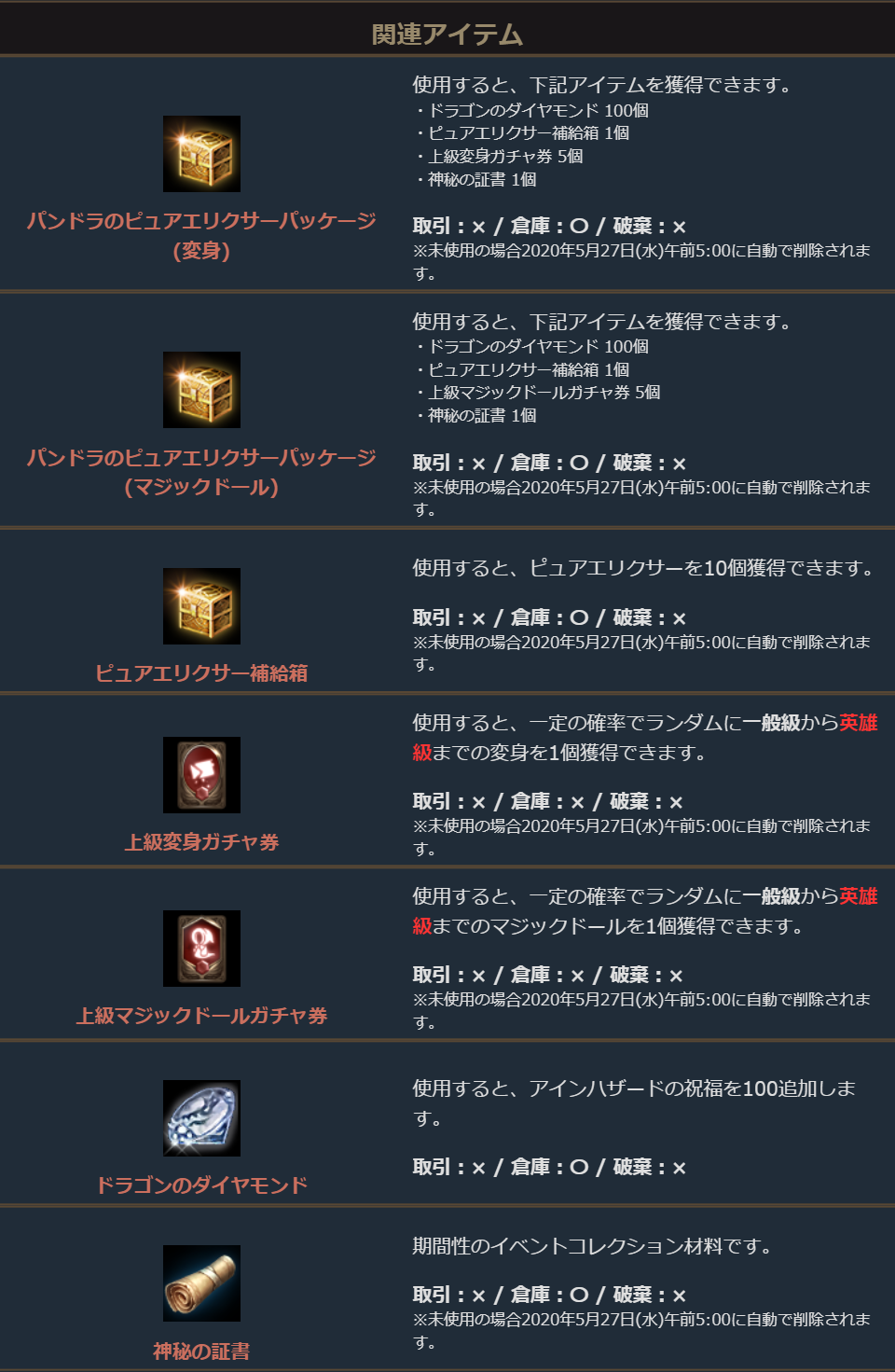 ※一部アイテムは未使用の場合、一定期間が経過すると自動で削除されます。詳しくは各アイテムの詳細をご確認ください。