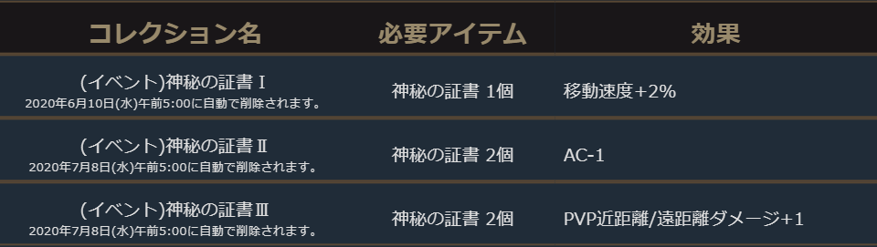 神秘の証書を使用した期間制のイベントコレクション効果は下記となります。