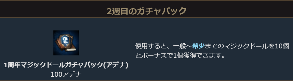 「1周年マジックドールガチャパック(アデナ)」も同様に使用すると、マジックドールガチャ10連+ボーナスガチャ1回に挑戦することができます。
