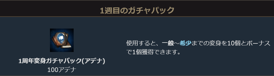 ゲーム内ショップで1週目は「1周年変身ガチャパック(アデナ)」を、2週目は「1周年マジックドールガチャパック(アデナ)」を100アデナで毎日獲得できます。