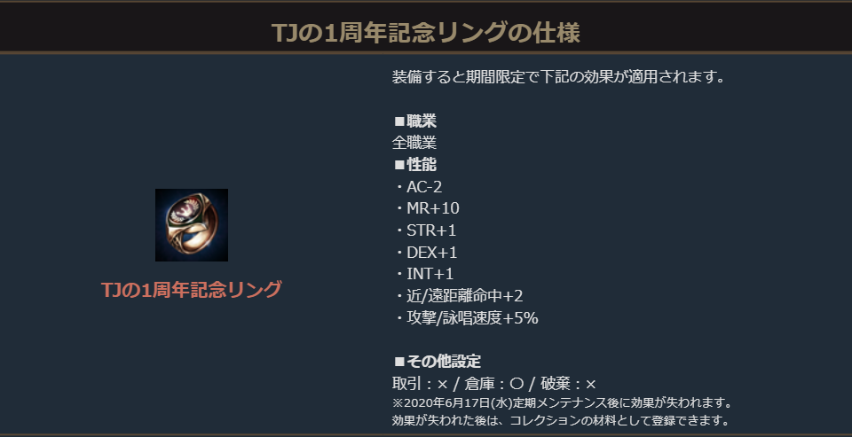TJの1周年記念リングの効果は2020年6月17日(水)定期メンテナンス開始前まで継続し、その後は効果が失われます。