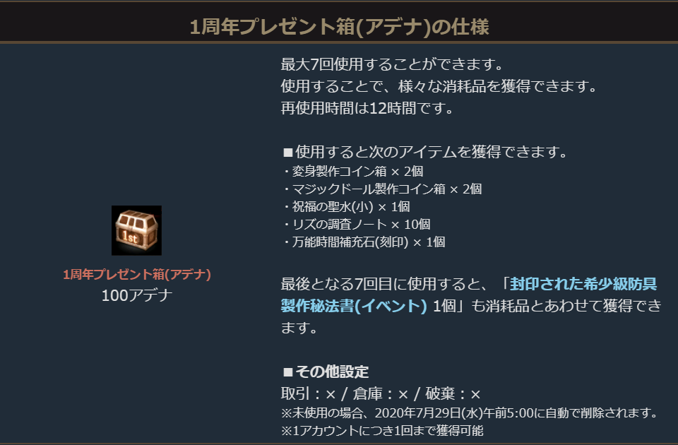 「1周年プレゼント箱(アデナ)」は、12時間ごとに合計7回使用できるアイテムで、使用する度に有用な消耗品を獲得できます。