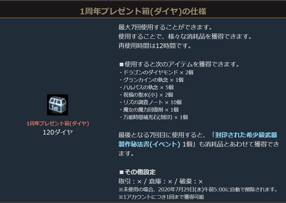 また、獲得アイテムは異なりますが、「1周年プレゼント箱(ダイヤ)」もが120ダイヤで獲得できます。