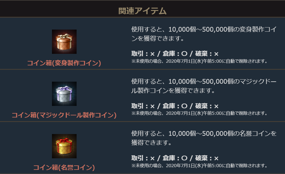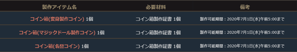 期間中、「コイン箱製作証書」を使用して製作を行うことができます。