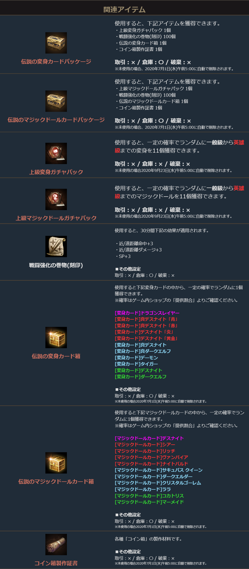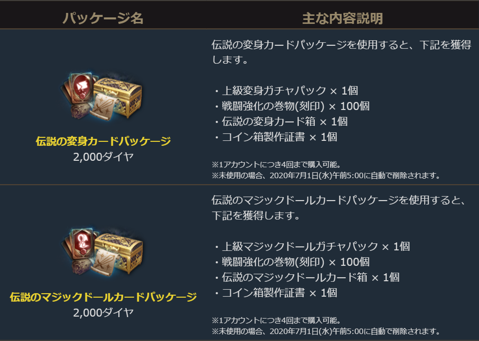2020年6月10日より、ゲーム内ショップで「伝説の変身カードパッケージ」と「伝説のマジックドールカードパッケージ」の販売を開始しました。