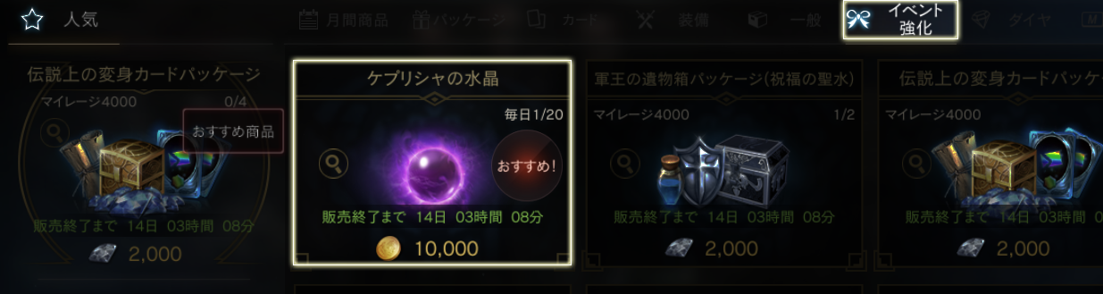 イベント期間中、ゲーム内ショップの「イベント強化」に「ケプリシャの水晶」が登場します。