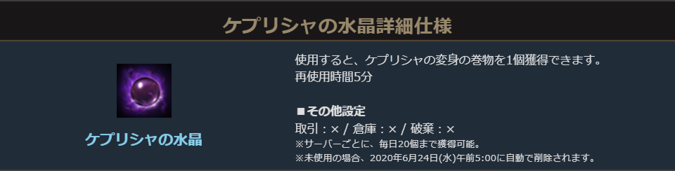 「ケプリシャの水晶」を使用すると、イベント期間限定の「ケプリシャの変身の巻物」を獲得することができます。