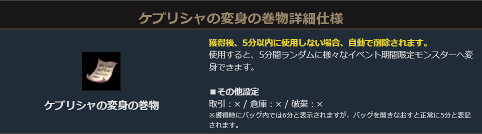 「ケプリシャの変身の巻物」は、イベント期間限定変身を行うことができますが、使用するまで何に変身するか判りません。