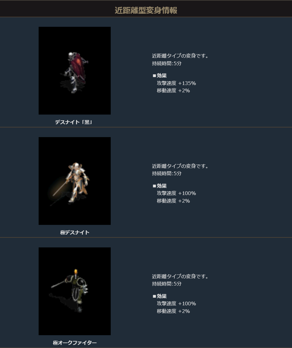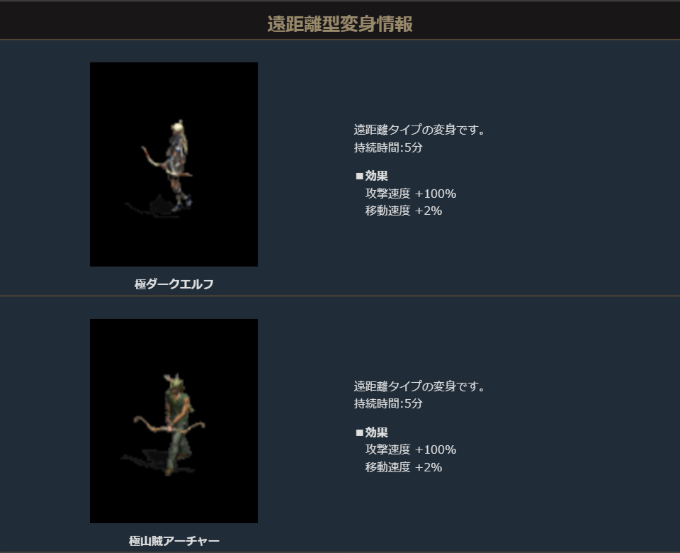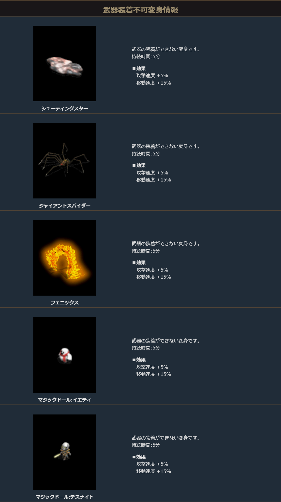 武器が着用できない変身もあるので、村の中で変身確認後に狩場へ移動することをおすすめします。