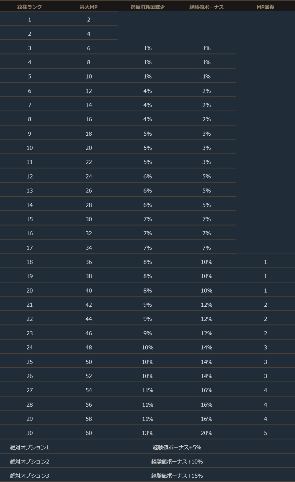 紋様ランクが上がるごとにMPが上昇し、3段階から祝福消耗量減少と経験値ボーナスが適用され、18段階からMP回復が上昇します。