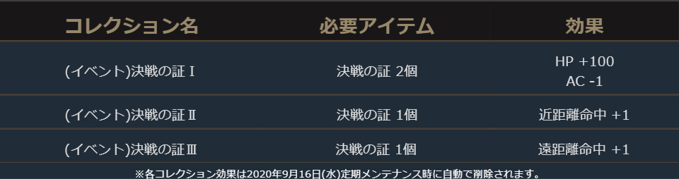 決戦の証を使用した期間限定のイベントコレクション効果は下記となります。