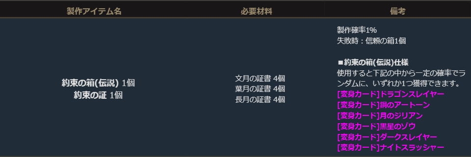 各種証書をそれぞれ4個ずつ(最大所持量)所持していると、「約束の箱(伝説)」の製作にチャレンジすることができます。