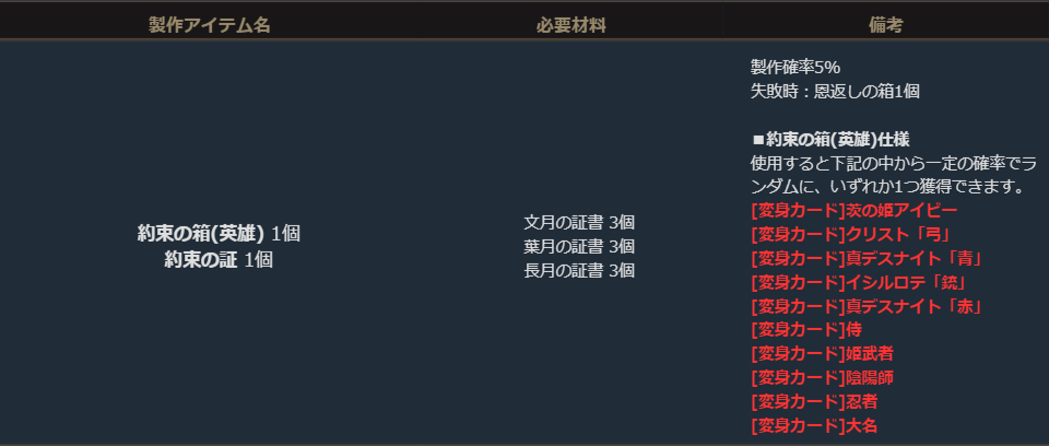 各種証書をそれぞれ3個ずつ所持していると、「約束の箱(英雄)」の製作にチャレンジすることができます。