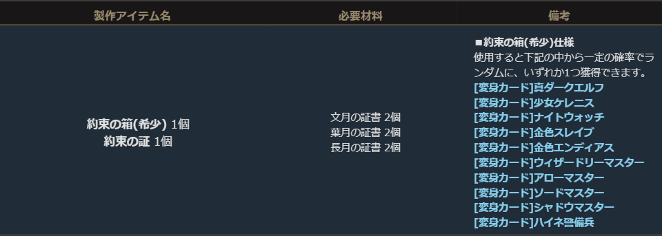 各種証書をそれぞれ2個ずつ所持していると、「約束の箱(希少)」の製作ができます。