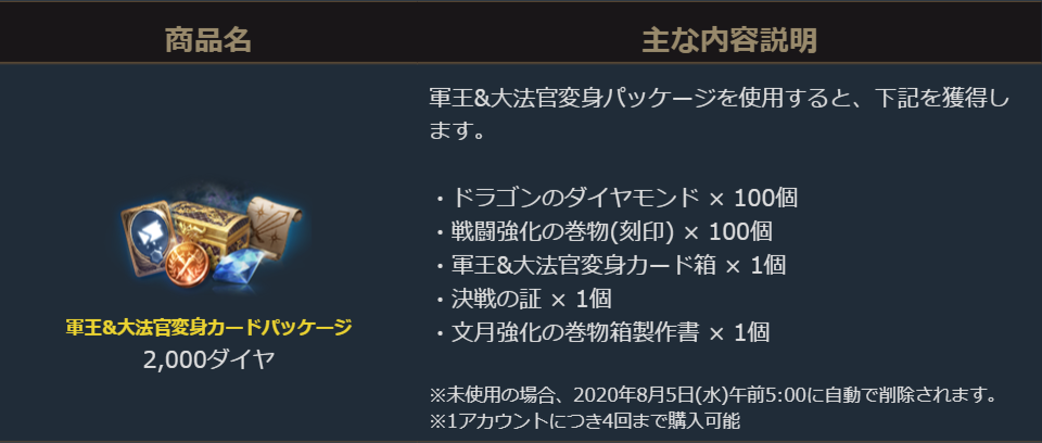 2020年7月8日より、ゲーム内ショップで「軍王&大法官変身カードパッケージ」の販売を開始しました。