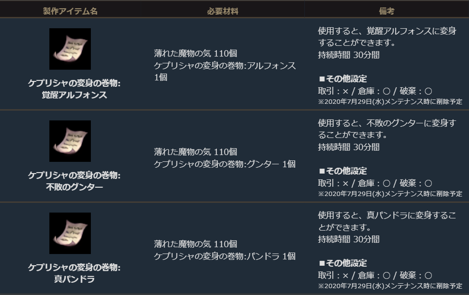 「契約のケプリシャの水晶」を使用すると、「アルフォンス」「パンドラ」「グンター」に変身できる各種ケプリシャの変身の巻物を獲得することができます。