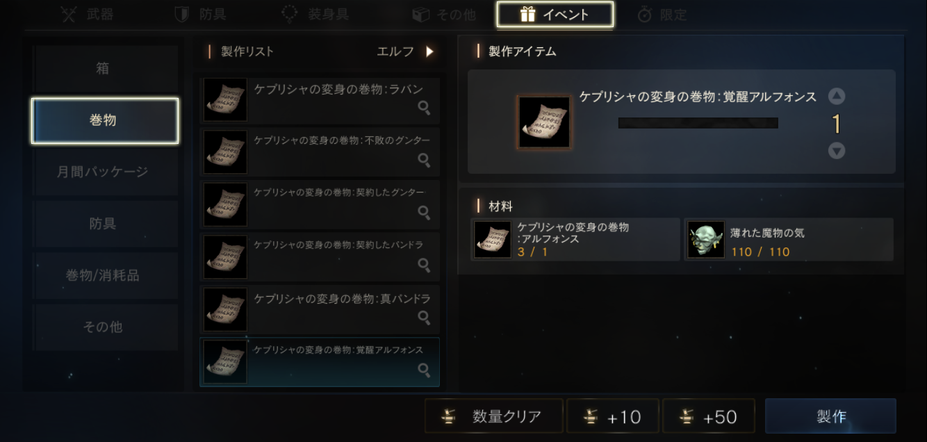 今回追加の「ケプリシャの変身の巻物」の製作も、引き続き製作画面内の「イベント」タブ>「巻物」から行うことができます。