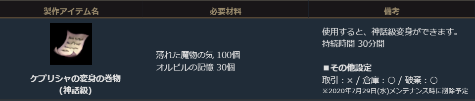 また、「契約のケプリシャの水晶」から獲得できる各種変身の巻物や、ブラックを除くエヌ・シーファイブ変身の巻物を材料として製作可能です。