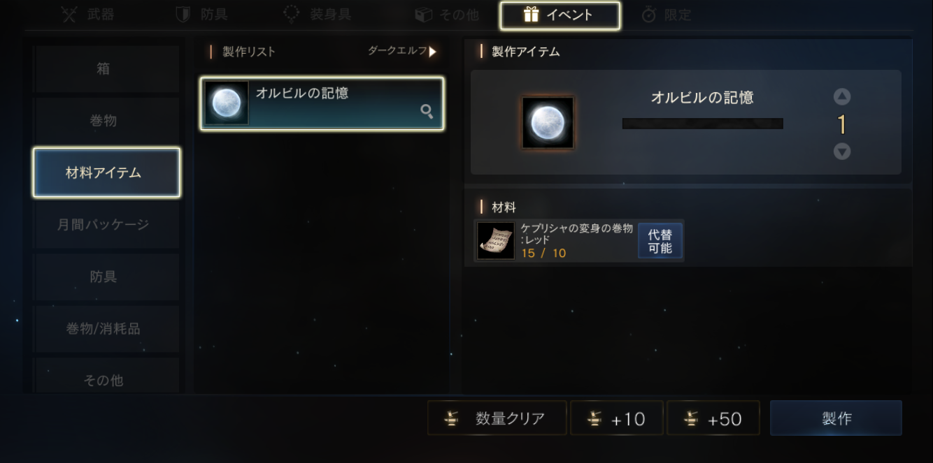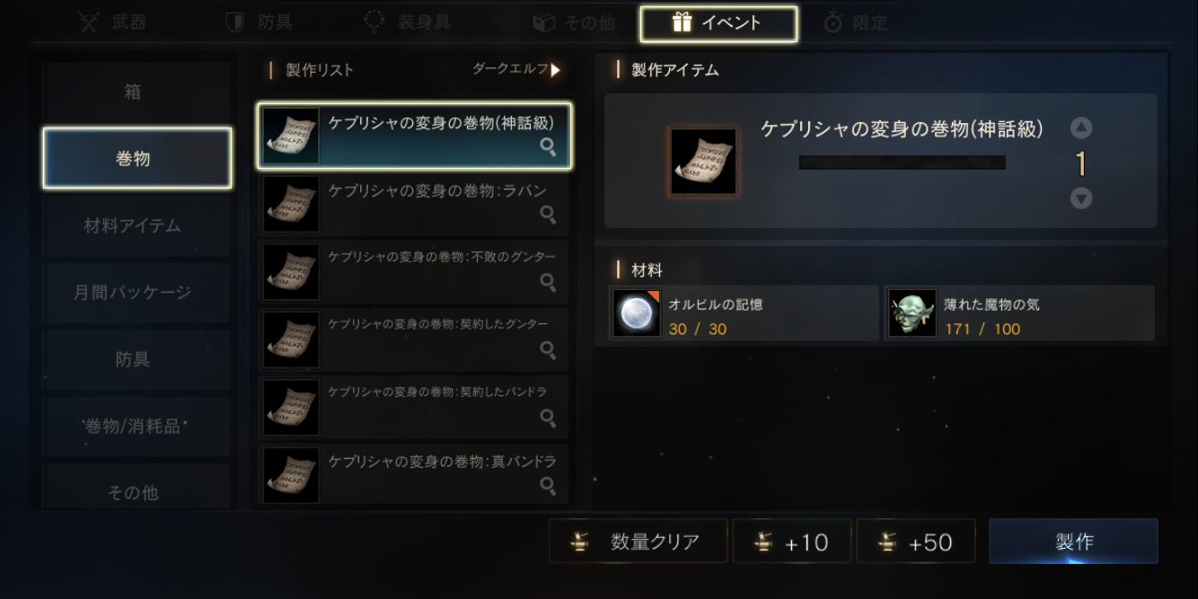 今回追加の「ケプリシャの変身の巻物」の製作も、引き続き製作画面内の「イベント」タブ>「巻物」から行うことができます。