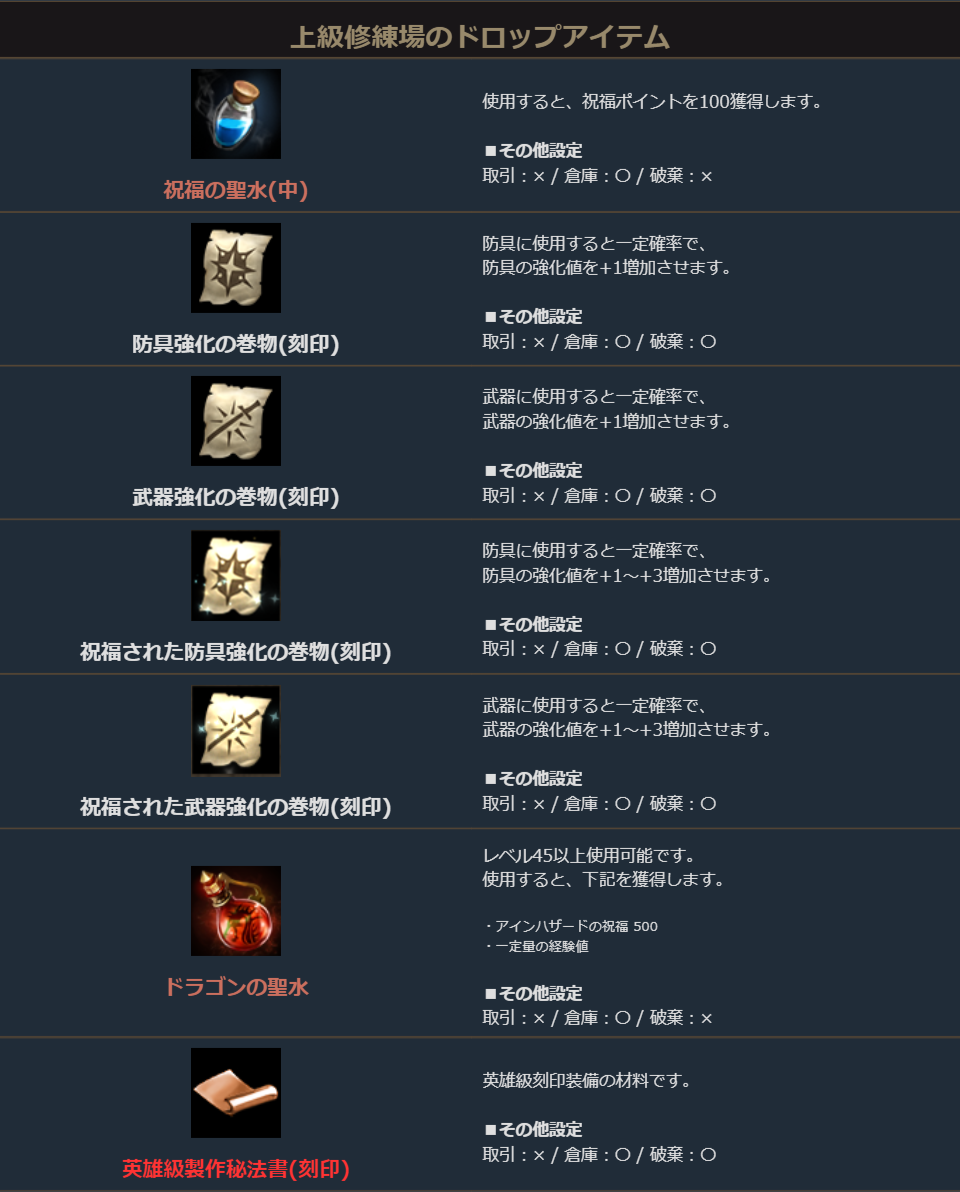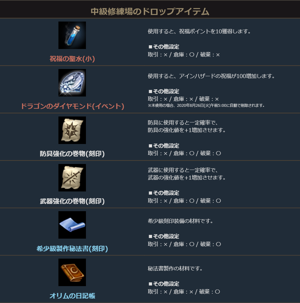 「中級修練場」と「上級修練場」のドロップは下記となります。