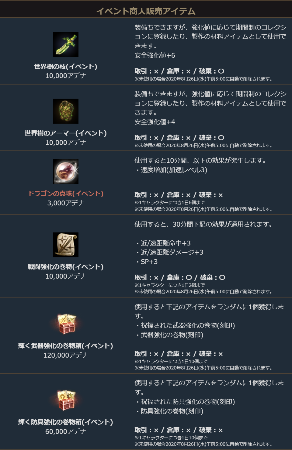 また、ギラン村/オーレン村/ハイネ村/アデン村に出現する「イベント商人」を通じて上記「世界樹の枝(イベント)」や「世界樹のアーマー(イベント)」や、消耗品、各種輝く強化の巻物箱をアデナで購入可能です。