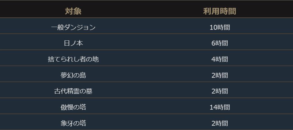 イベント期間中、下記ダンジョンの入場時間2倍に増加します。どんどんご利用ください!