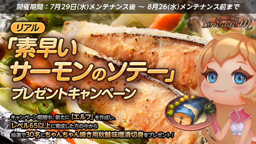 キャンペーン期間中に新たに「エルフ」を作成しレベル65以上に育成した方の中から抽選で30名に1万円分の「ちゃんちゃん焼き用秋鮭味噌漬切身」をプレゼント!