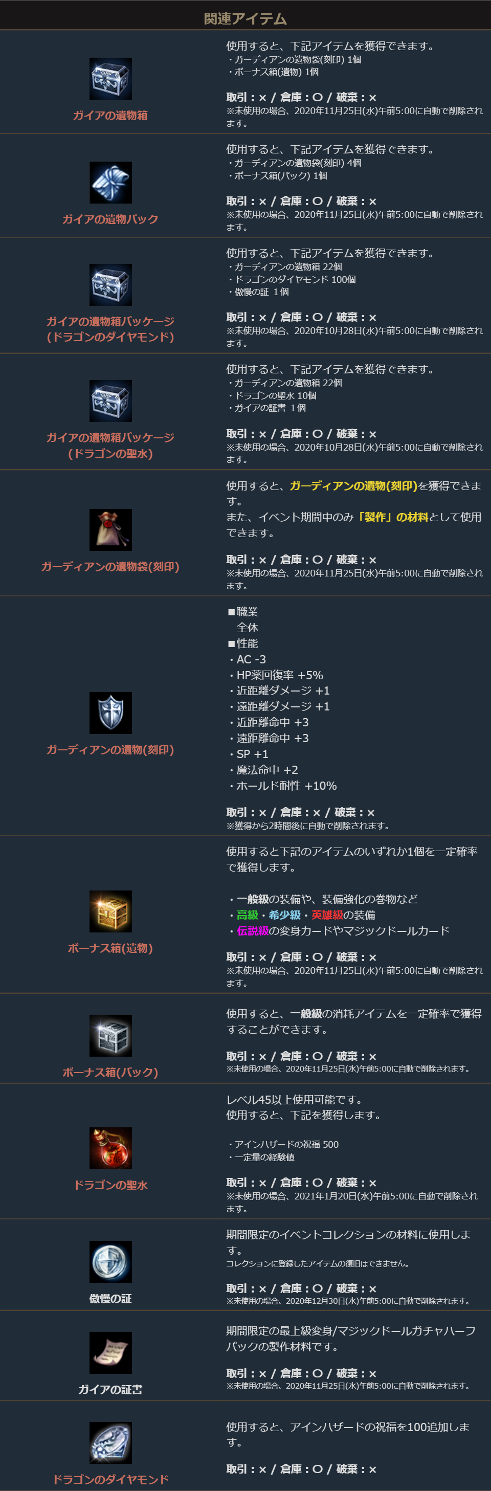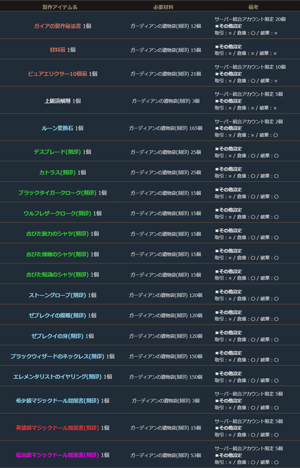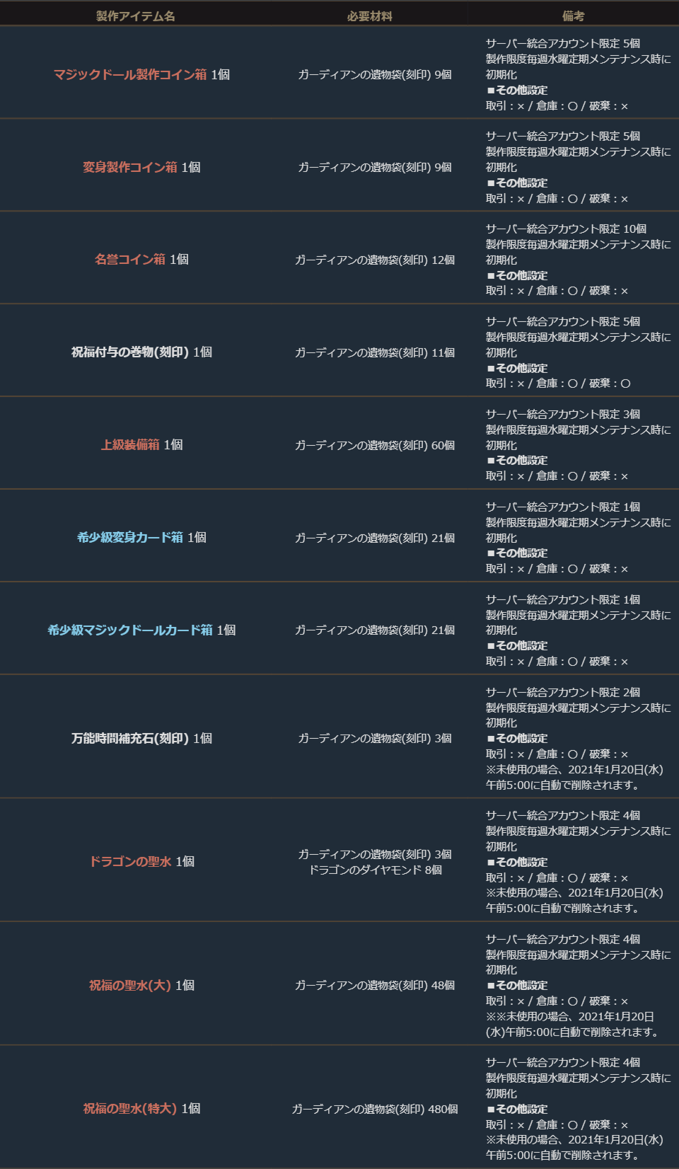 期間中、「ガーディアンの遺物袋(刻印)」を使用して製作を行うことができます。