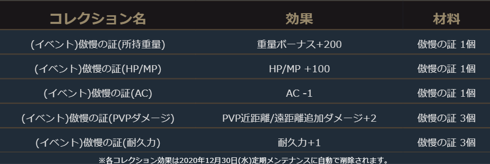 └ダンテスの成長箱で獲得できた各種傲慢の証コレクションの有効日は2020年10月7日(水)定期メンテナンス終了時までとなっておりますので、有効日の差異でご確認ください。