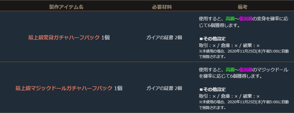 ※期間限定の製作アイテムは、製作可能期間のみゲーム内の「製作」より製作することができます。