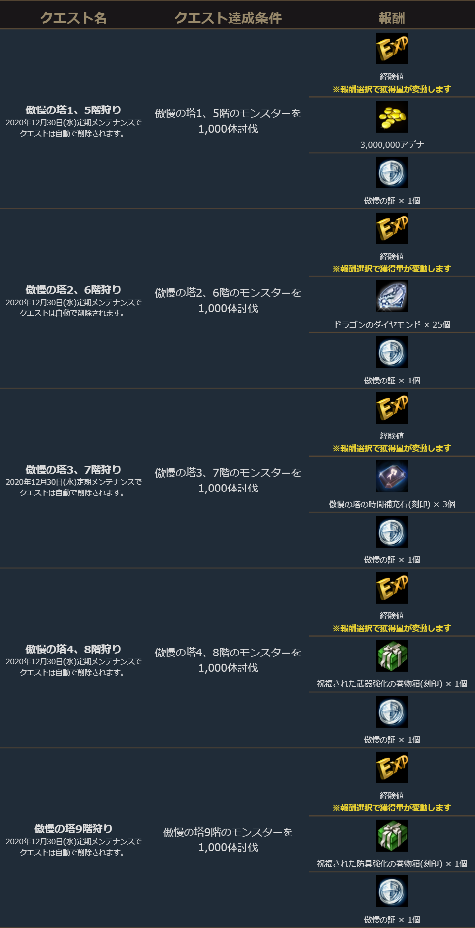 ※傲慢の証は、「ガイアの遺物パッケージ(ドラゴンのダイヤモンド)」で最大4個、期間限定製作1週目に製作できる「各種傲慢の塔クエスト書簡」で最大5個入手することができます。