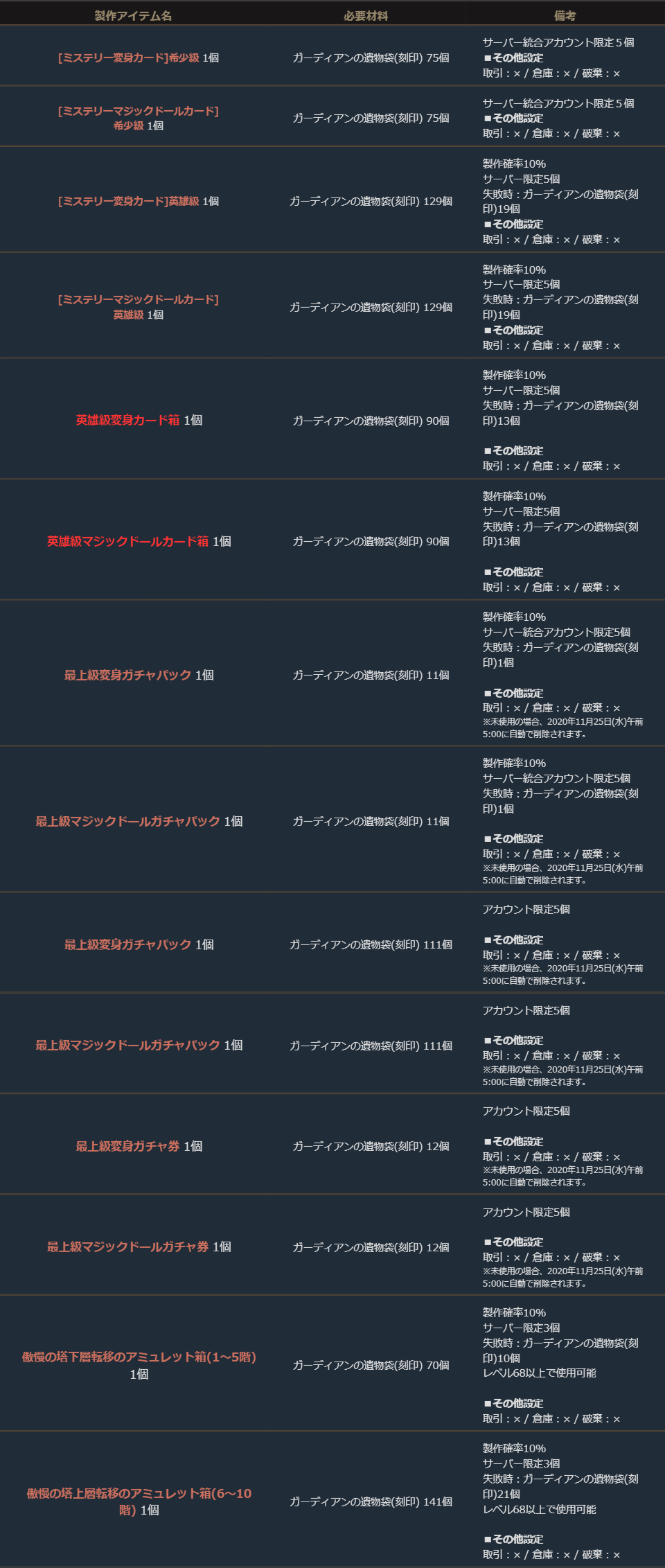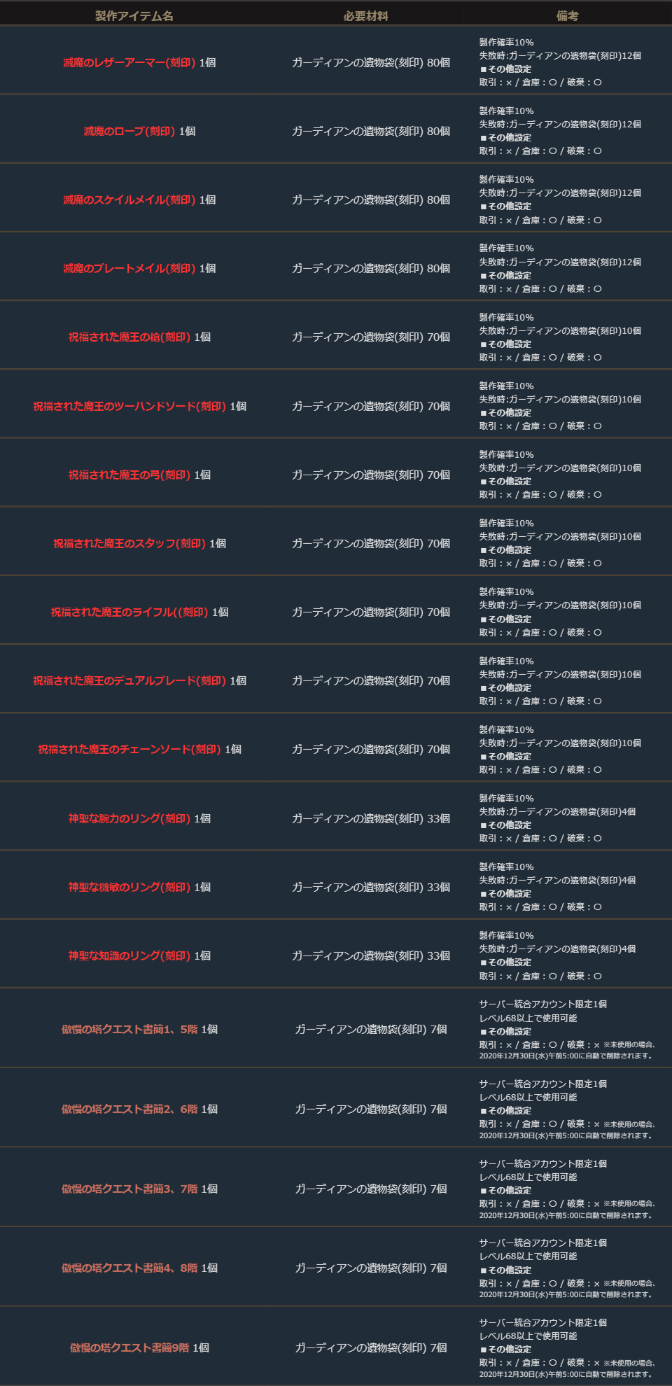 2020年9月29日(火)定期メンテナンス後~2020年10月28日(水)定期メンテナンス前までの間、下記アイテムを製作することができます。