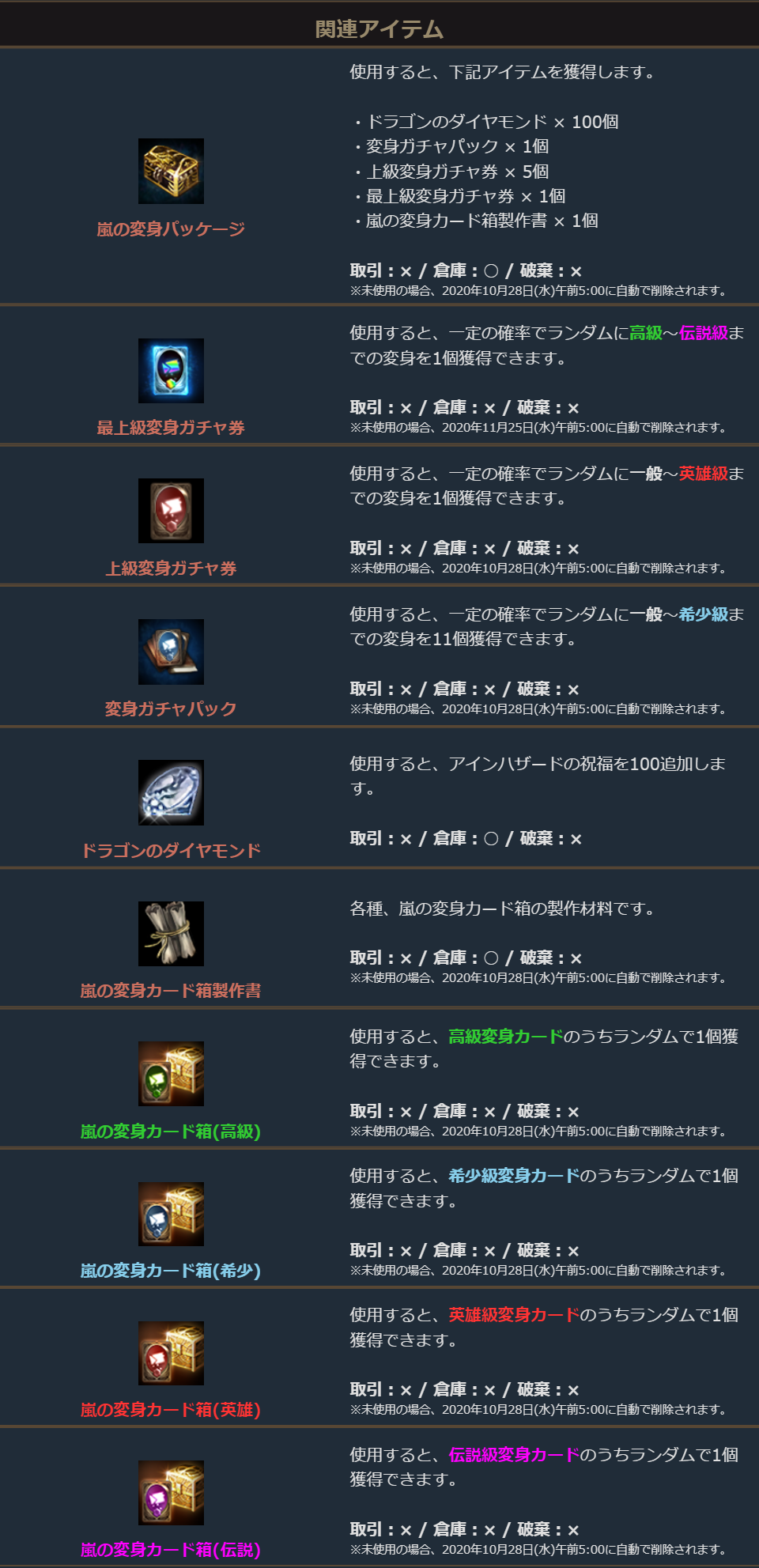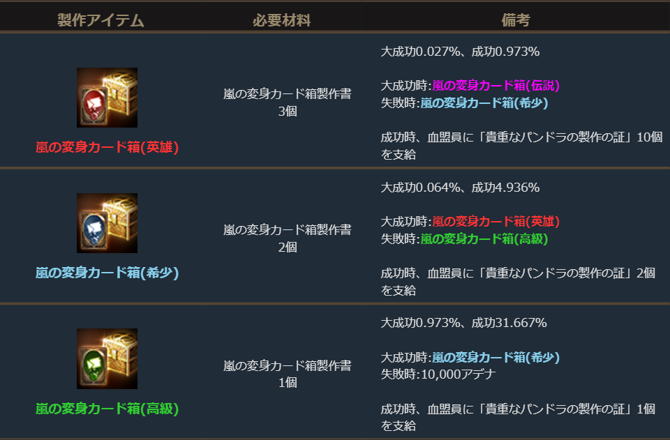 下記の期間中、メニューの [製作>イベント>変身/マジックドール>変身カード] の製作リストから「嵐の変身カード箱製作書」を使用して、各種嵐の変身カード箱の製作を行うことができます。