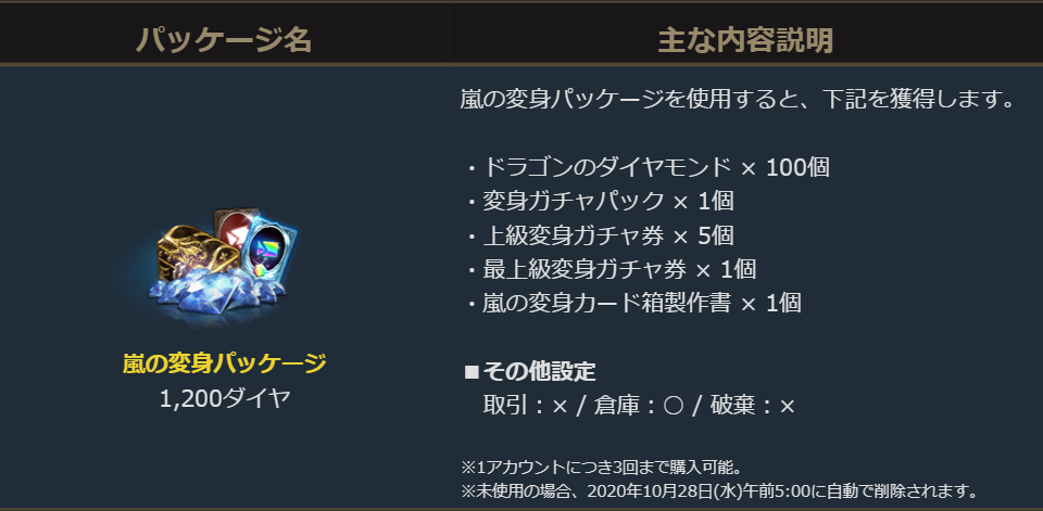 2020年10月7日より、ゲーム内ショップで「嵐の変身パッケージ」の販売を開始しました。