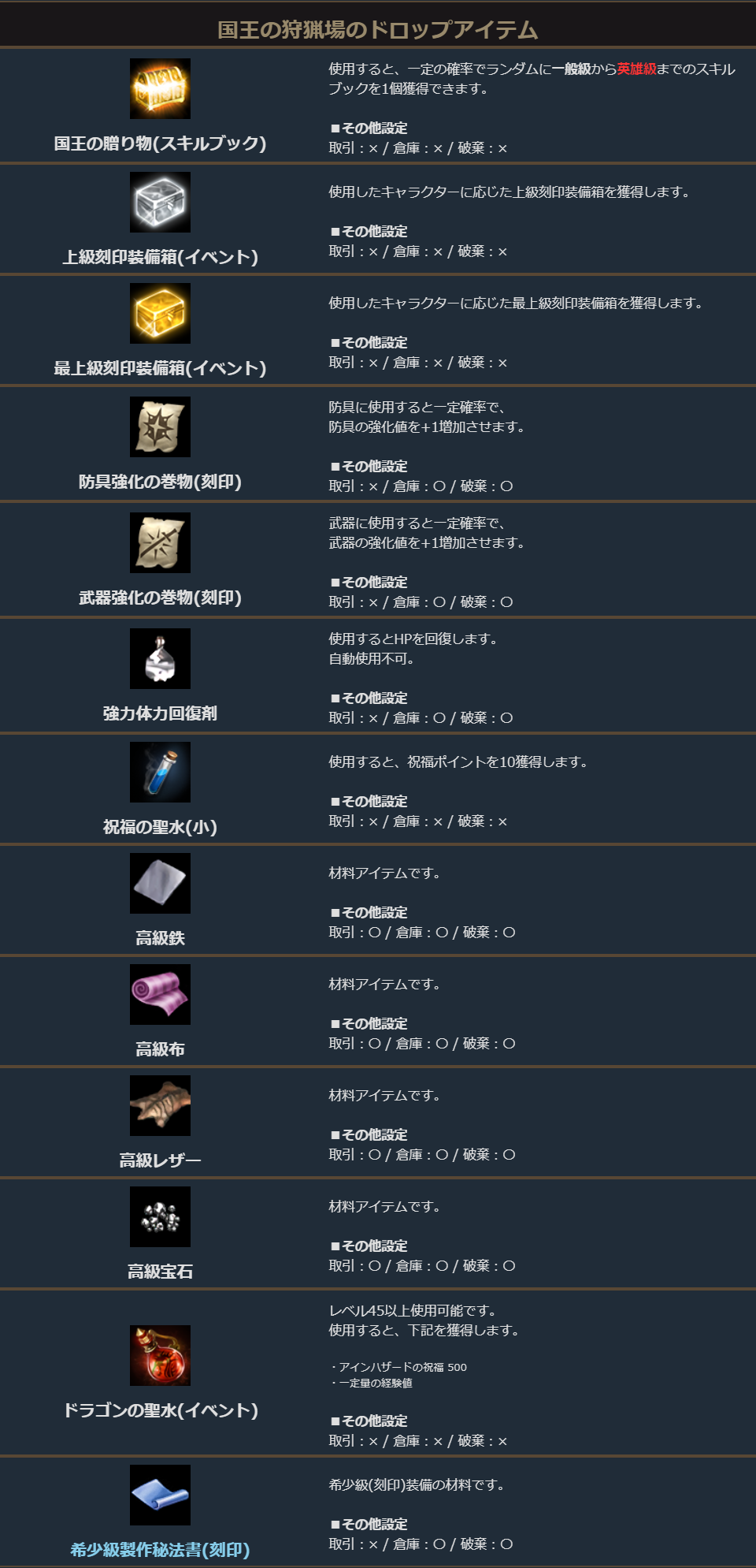 国王の狩猟場では、ドラゴンの聖水や希少級製作秘法書のほか、一般級~英雄級のスキルブックがランダムに手に入る「国王の贈り物(スキルブック)」がドロップします。