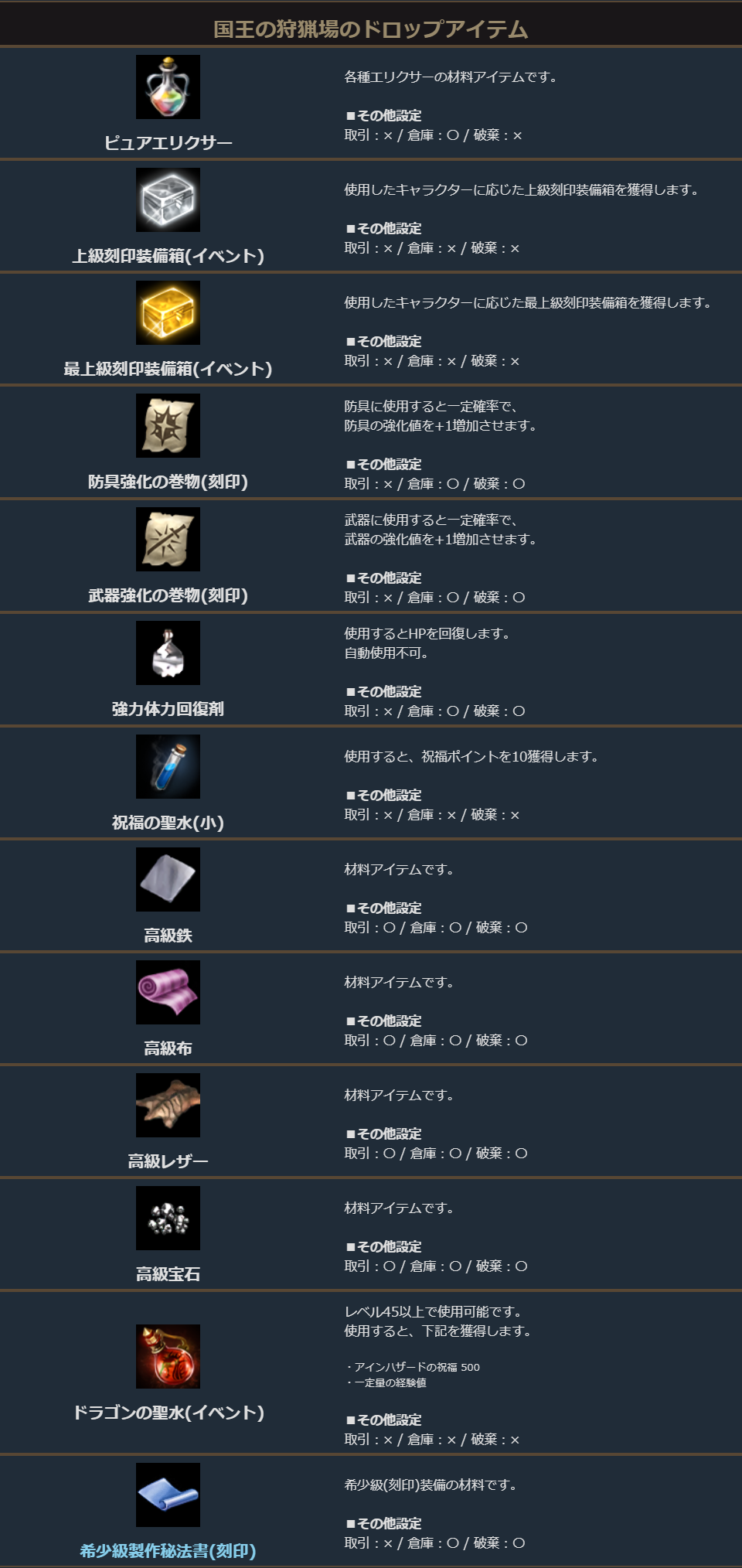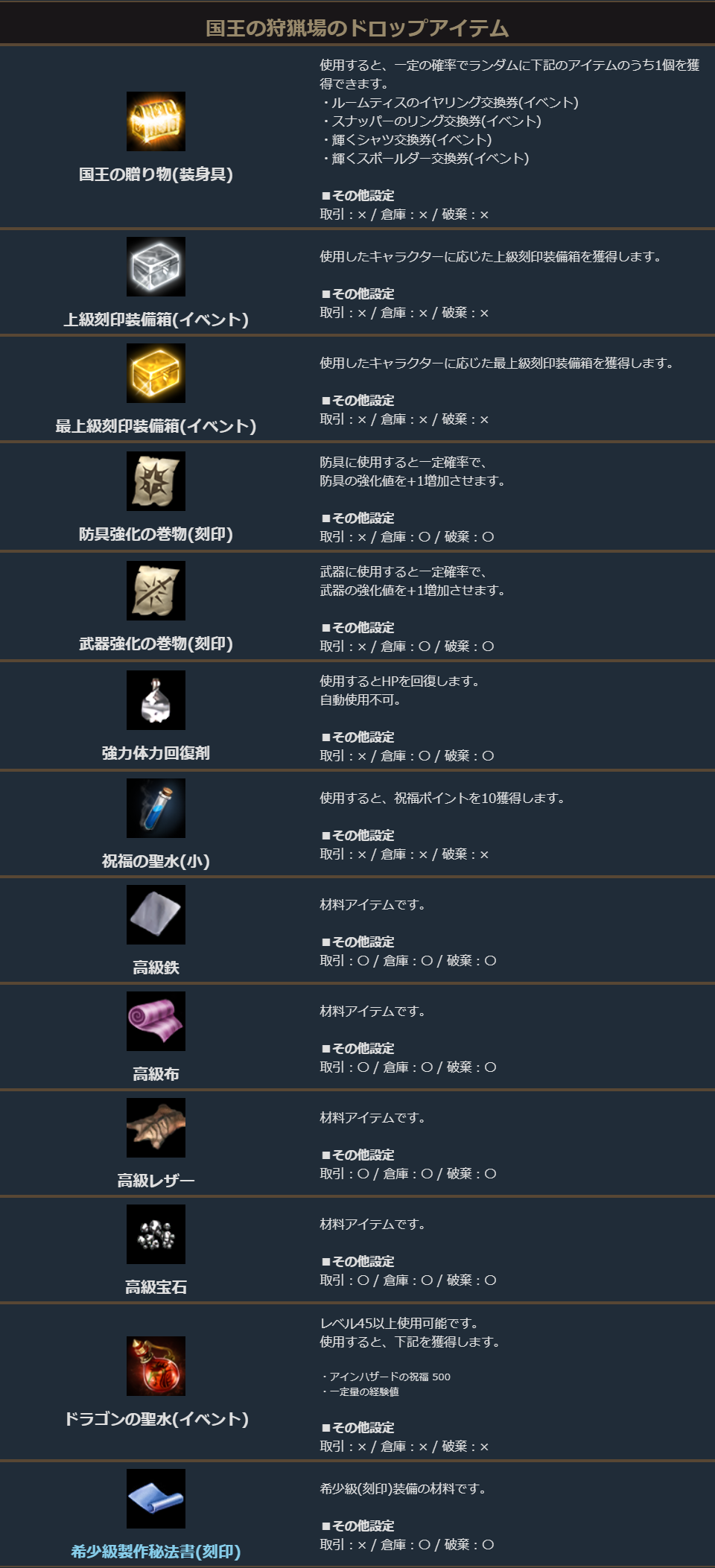国王の狩猟場では、ドラゴンの聖水や希少級製作秘法書のほか、各種装身具の製作材料がランダムに手に入る「国王の贈り物(装身具)」がドロップします。