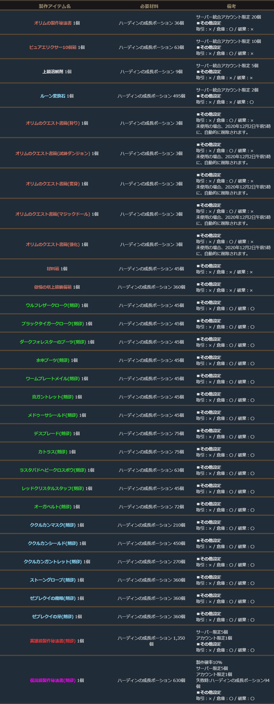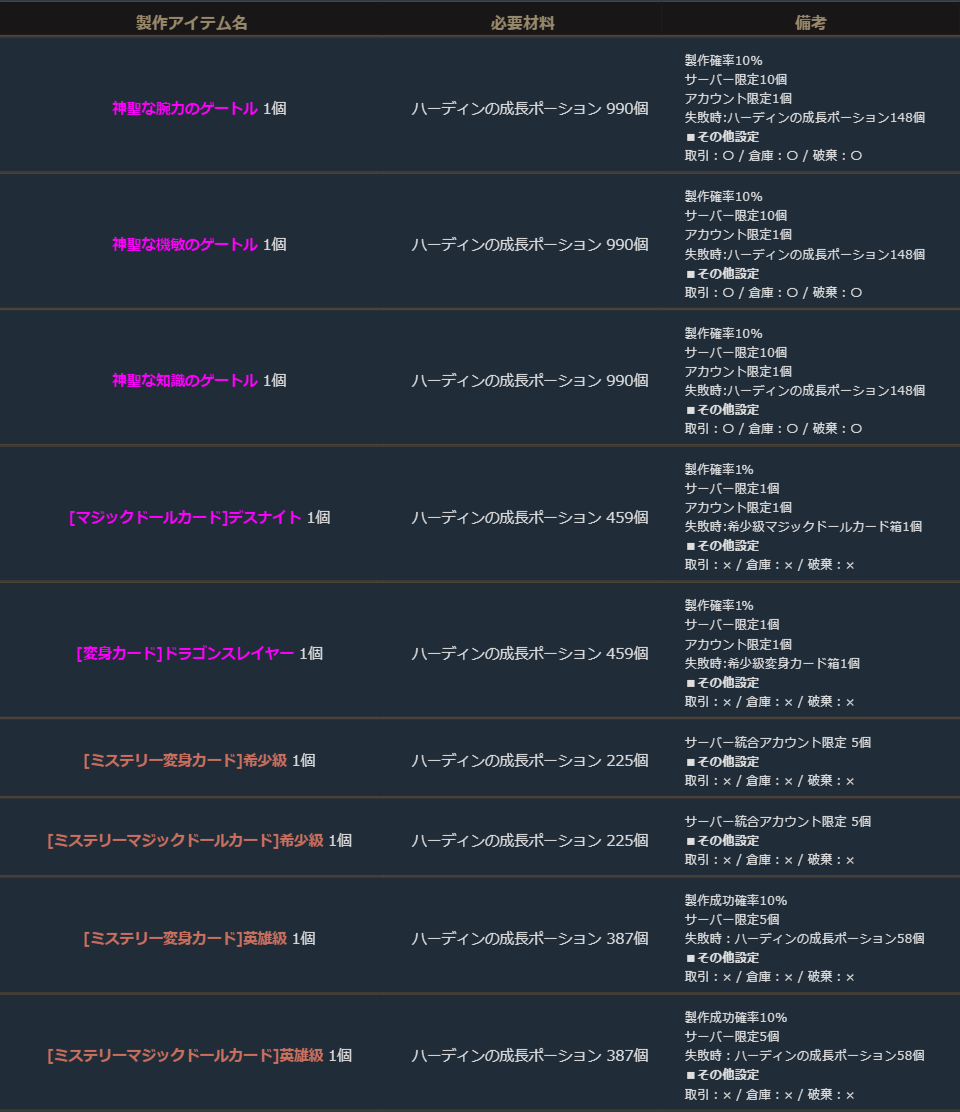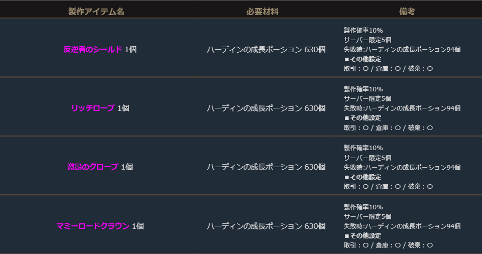 ※サーバー数量限定の製作アイテムは、各サーバーで製作できる数量に上限があります。