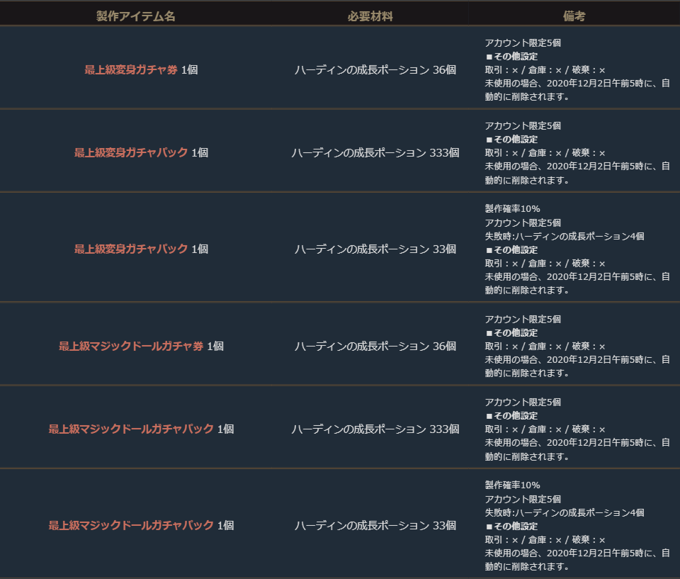 2020年10月28日(水)メンテナンス後~2020年12月2日(水)メンテナンス前までの間、下記アイテムを製作することができます。