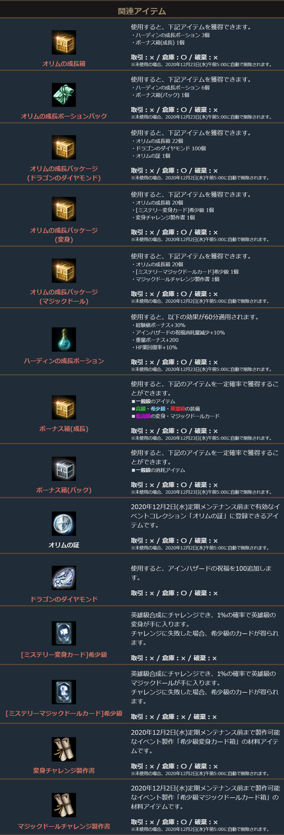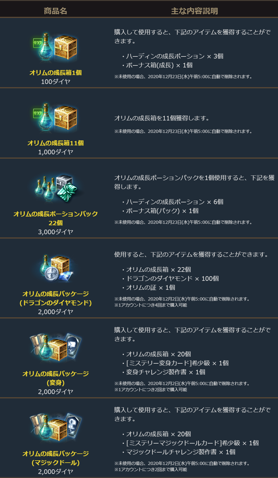 「オリムの成長パッケージ(ドラゴンのダイヤモンド)」に付属しているオリムの証を使用した期間制のイベントコレクション効果は下記となります。