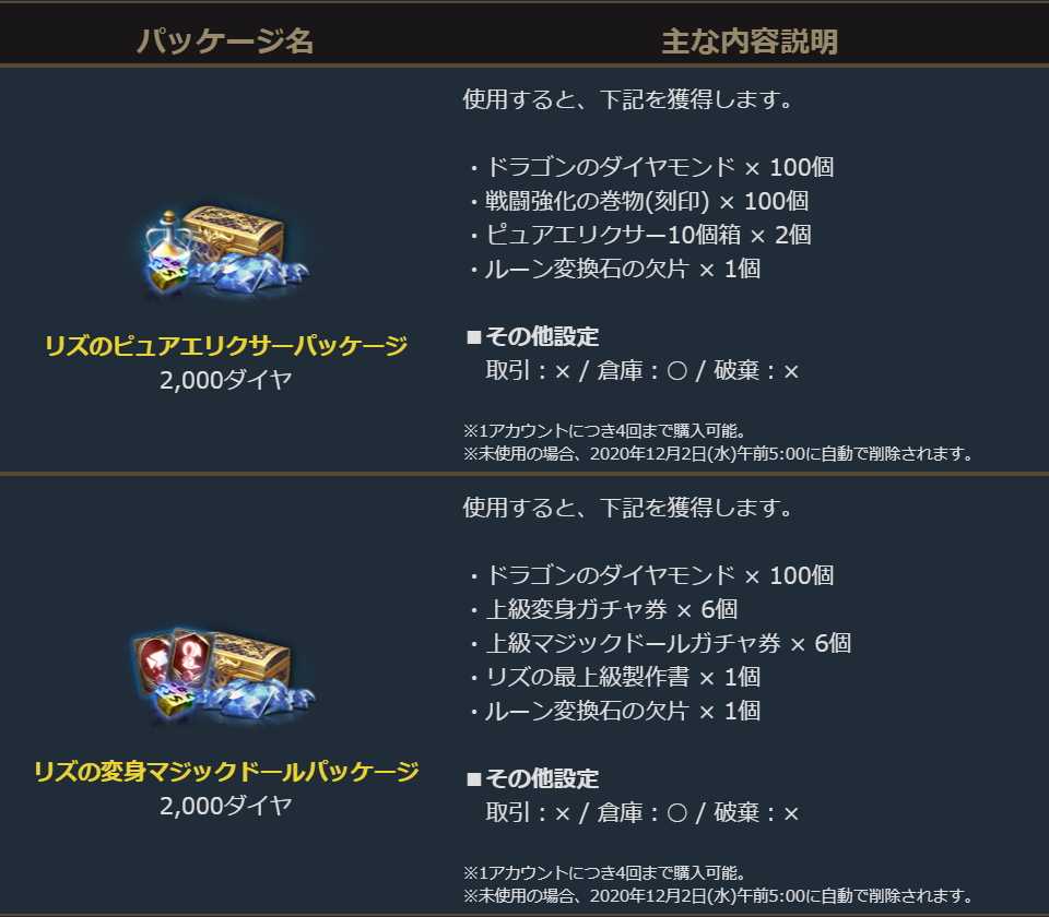 ピュアエリクサーや各種ガチャ券のほか、ルーン変換石の材料を入手できるお得なパッケージです。