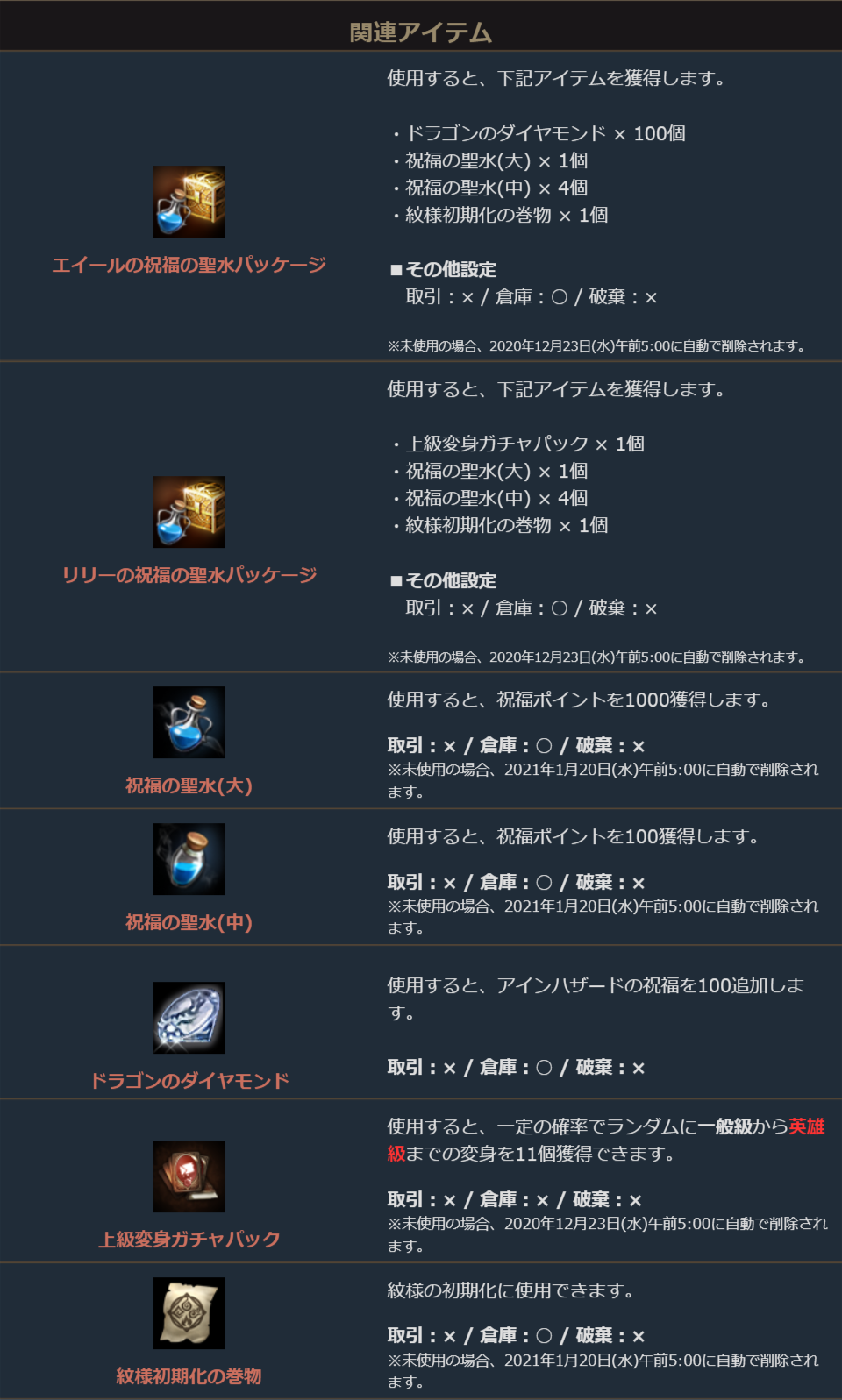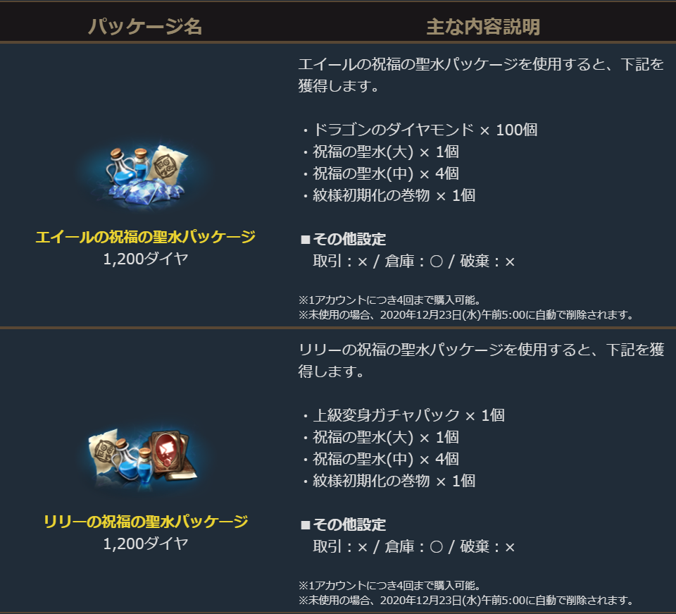 2020年12月2日より、ゲーム内ショップで「EP.3 DUAL FORCESアップデート記念 祝福の聖水パッケージ」の販売を開始しました。