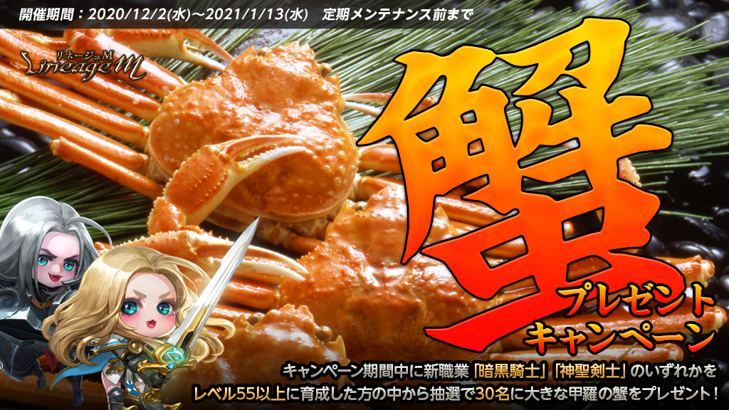 キャンペーン期間中に新職業暗黒騎士、神聖剣士のいずれかをレベル55以上に育成した方の中から抽選で計30名様に1万円分の蟹をプレゼント!