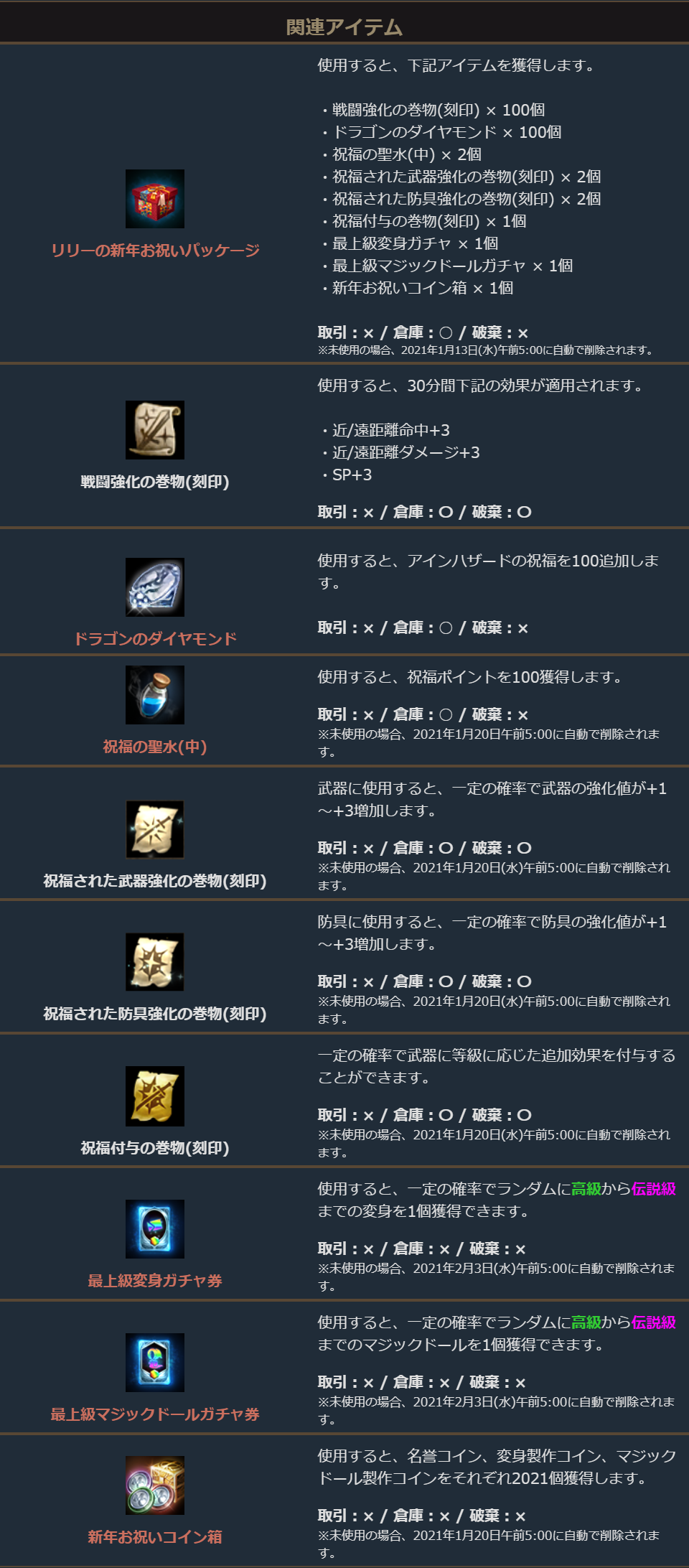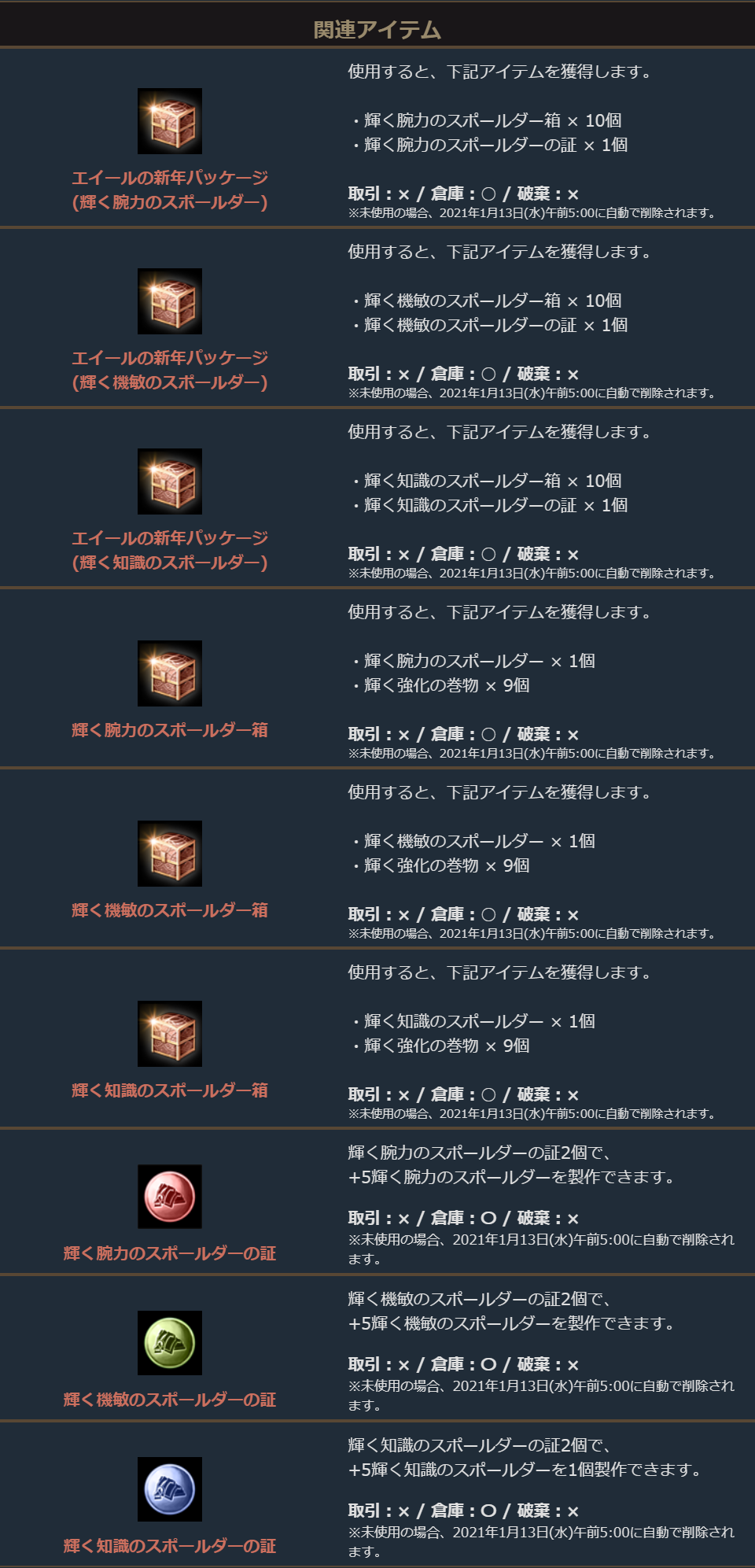 ※一部アイテムは未使用の場合、一定期間が経過すると自動で削除されます。詳しくは各アイテムの詳細をご確認ください。