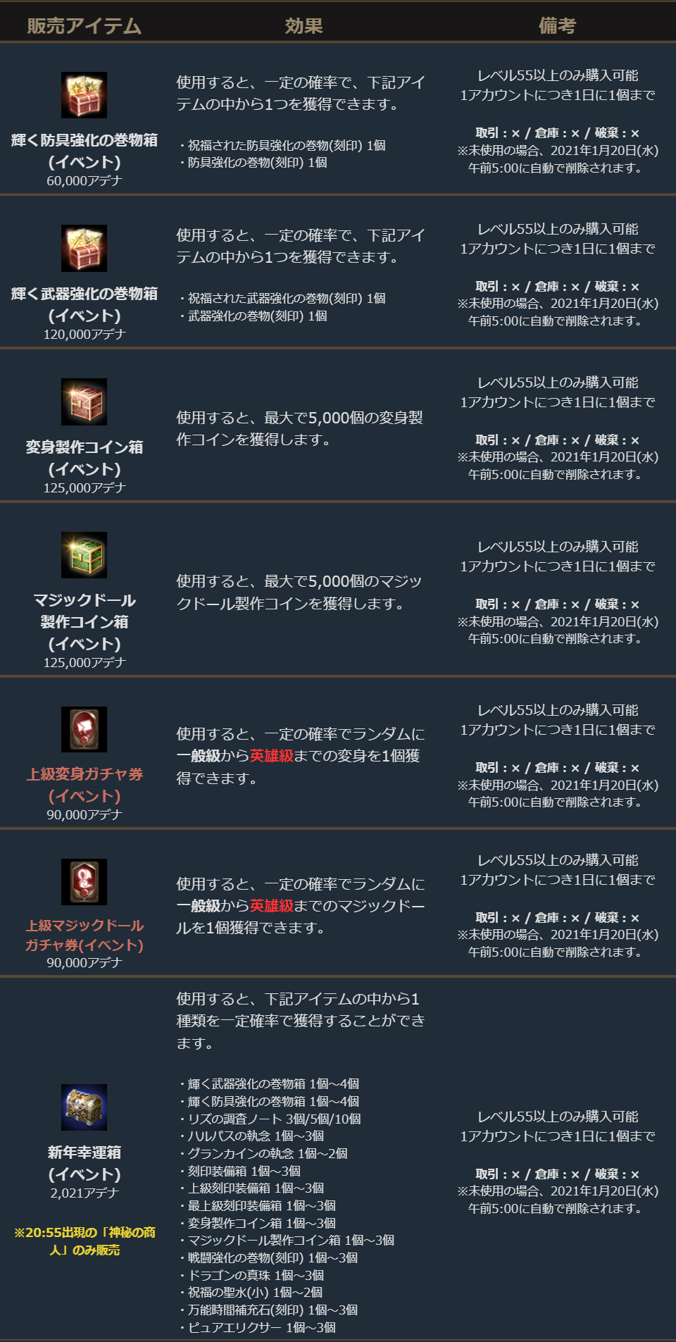 また、21年新年を記念して、20:55~21:00に出現する「神秘の商人」からは、「新年幸運箱(イベント)」を購入することができます。