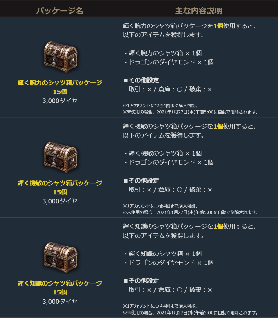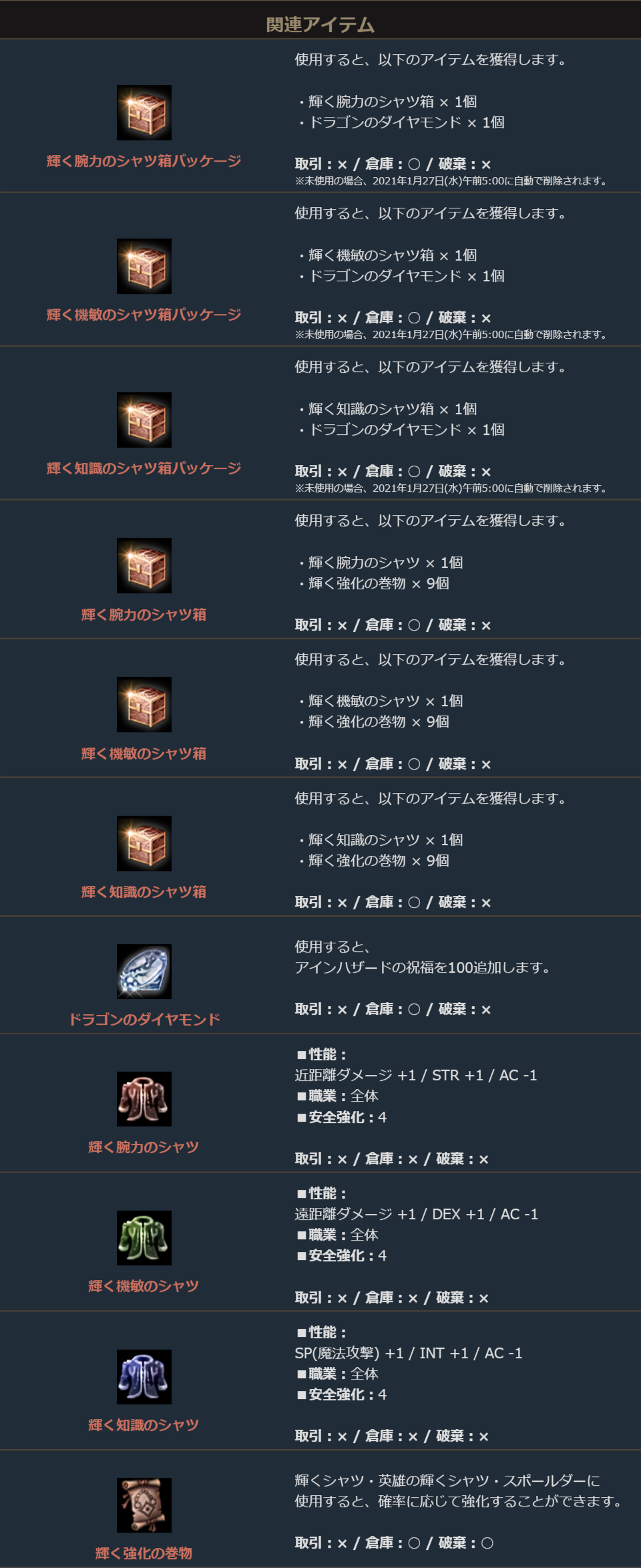 「英雄の輝くシャツ」の実装を記念して、各種「輝くシャツ箱」と「ドラゴンのダイヤモンド」が獲得できる