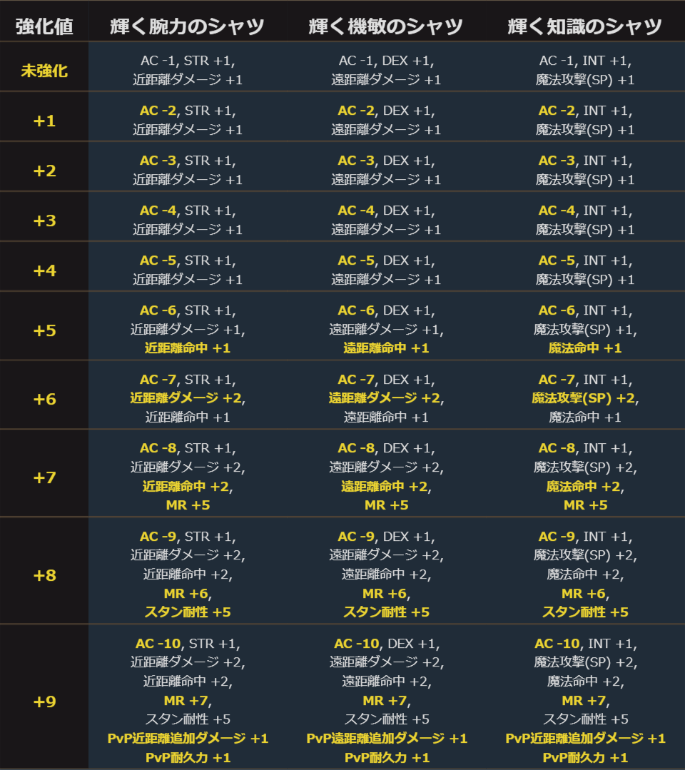 「輝く腕力のシャツ」「輝く機敏のシャツ」「輝く知識のシャツ」は、付属する「輝く強化の巻物」で強化することができます。